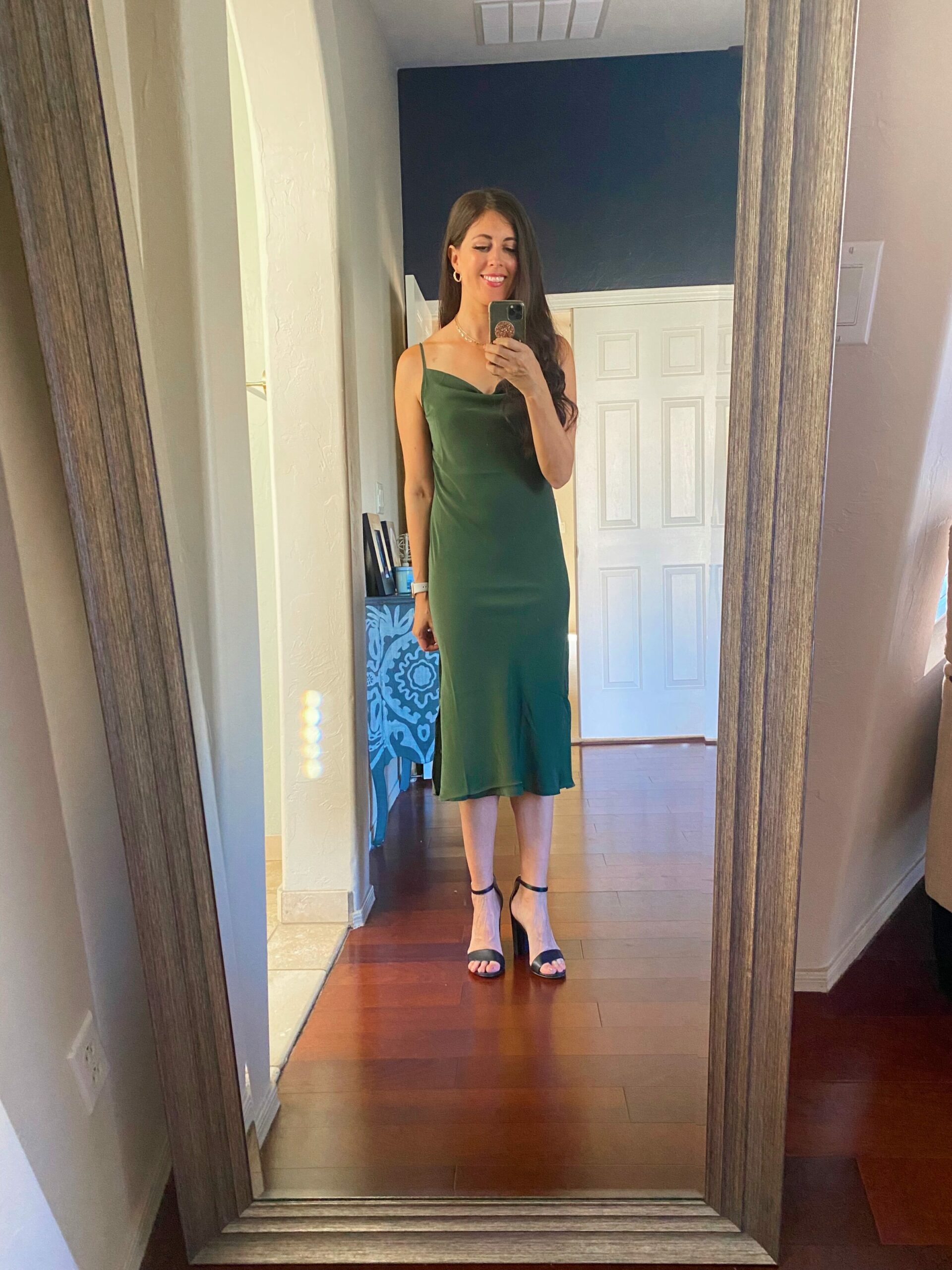 I wore this slip dress for our family pictures with a leather jacket. I love that you can dress it up with heels, or dress it down with boots and a sweater layered over it. You can also wear an off-shoulder sweater with it and low-top sneakers. It’s so versatile, and the perfect amount of festive flair for the holiday season.