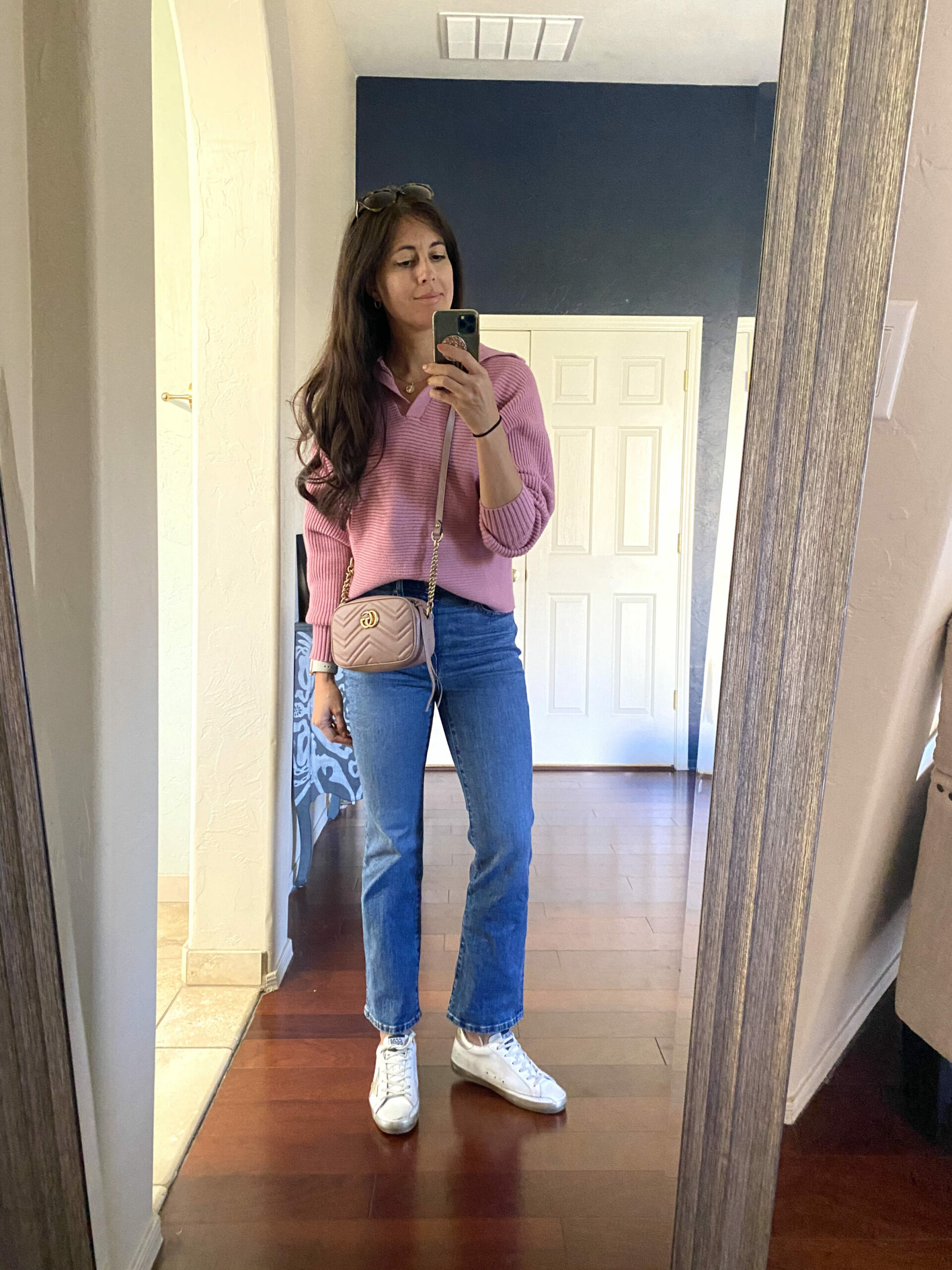 I’m wearing this sweater while I write this post! The collar gives it a little something extra and it’s cute with jeans and my Spanx faux leather leggings.