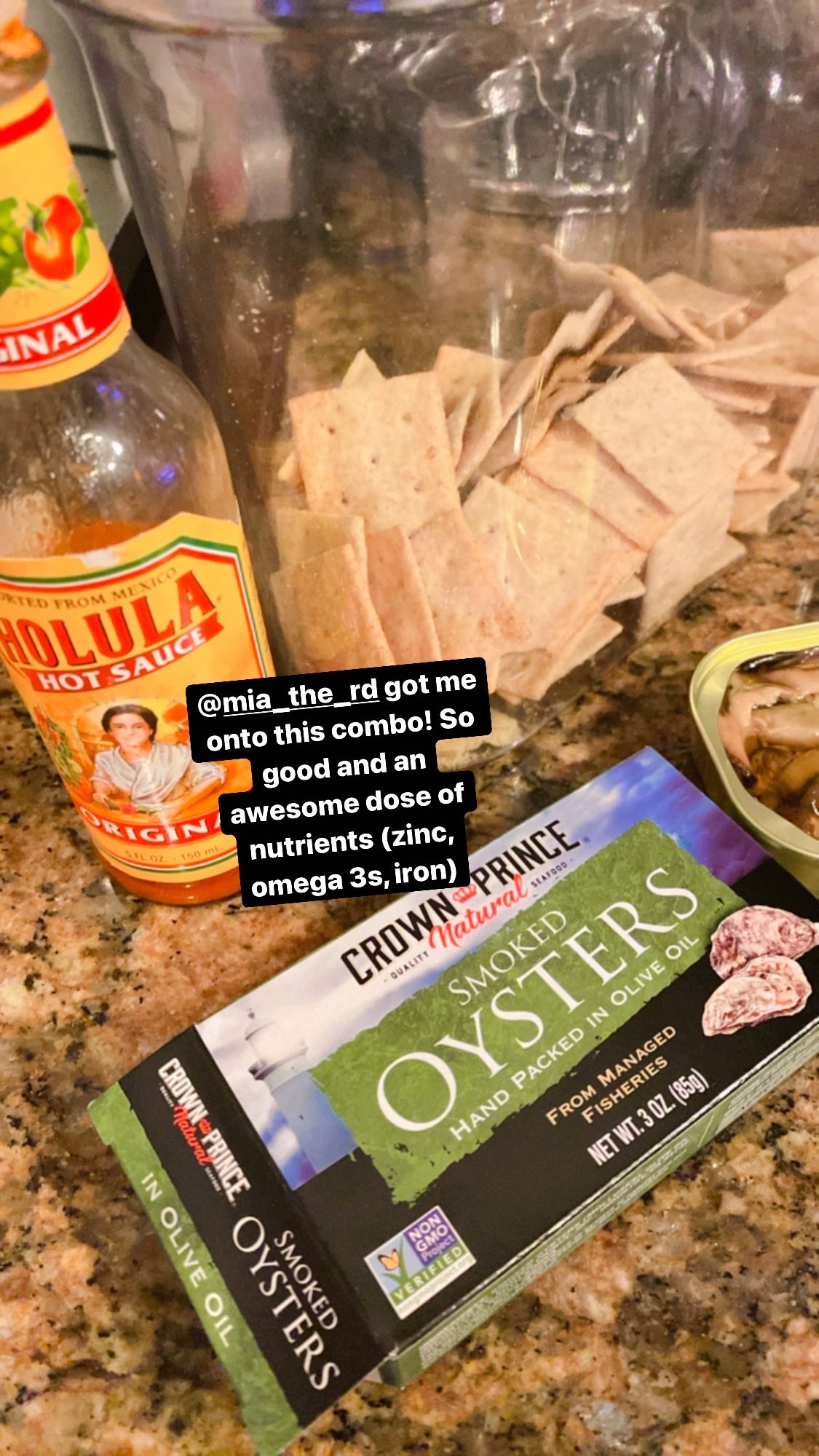 Random snack idea that I fell in love with recently thanks to Mia: smoked oysters with hot sauce and Simple Mills crackers. Don’t knock it till ya try it.