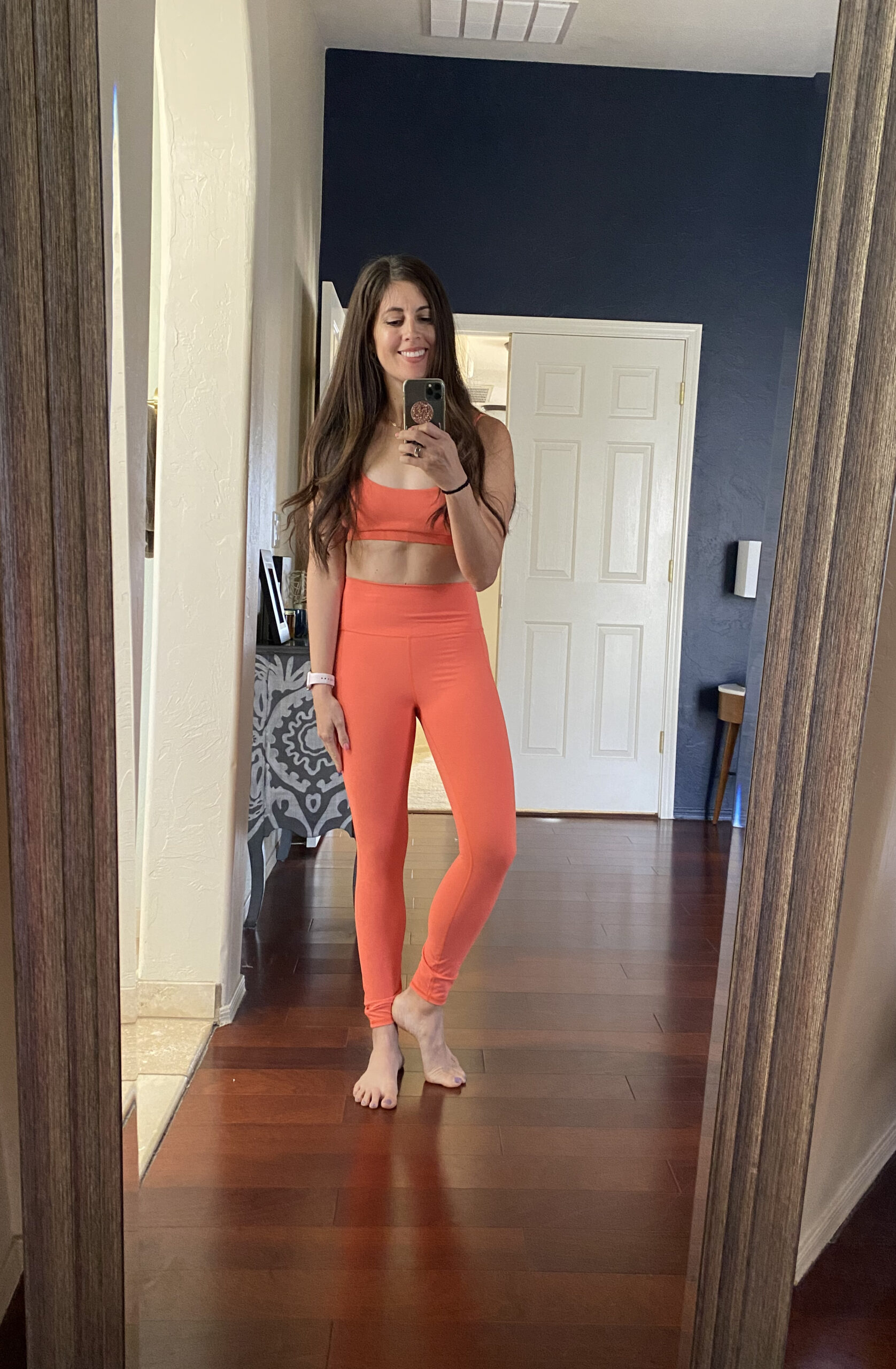 Vuori sent a package of goodies including this orange set! In this pic, I’m wearing the daily bra and the studio pocket leggings. If you haven’t tried their joggers yet, they absolutely live up to the hype. The fabric is lighter and stretchier than I expected and you can wear the to the gym or out and about with a tee and jean jacket.